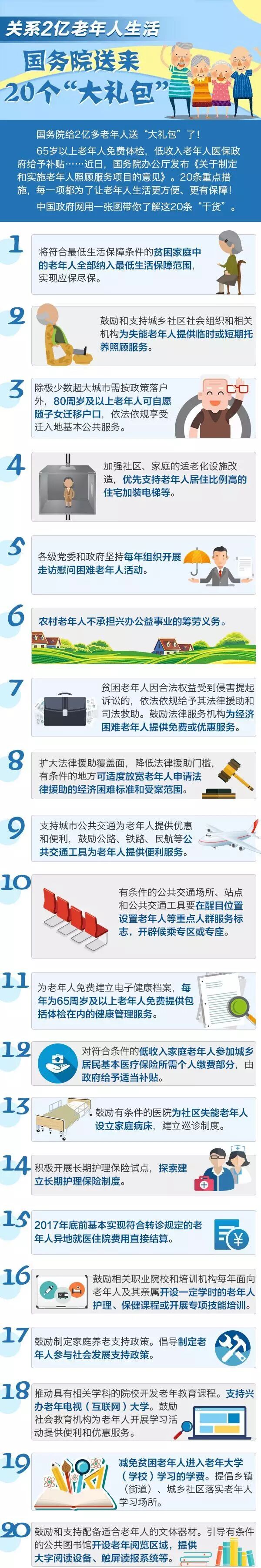 近日,国务院办公厅发布《关于制定和实施老年人照顾服务项目的意见》。20条重点措施,每一项都为了让老年人生活更方便、更有保障!下面一张图带你了解这20条“干货”。